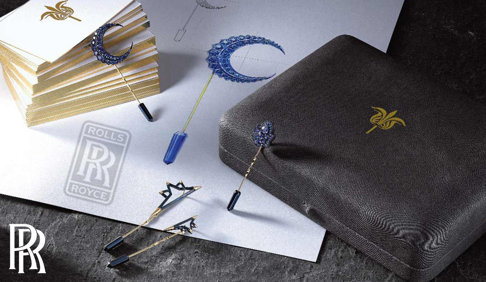 The limited edition lapel pins were inspired by the special edition Dawn Rolls-Royce, which was launched in 2016. Co-founder Charles Rolls was an eccentric English aristocrat whose love of aviation and motoring was referred to by Ana in these designs; the emblems chosen were celestial symbols, the moon and stars as a subtle nod to navigation from the past.