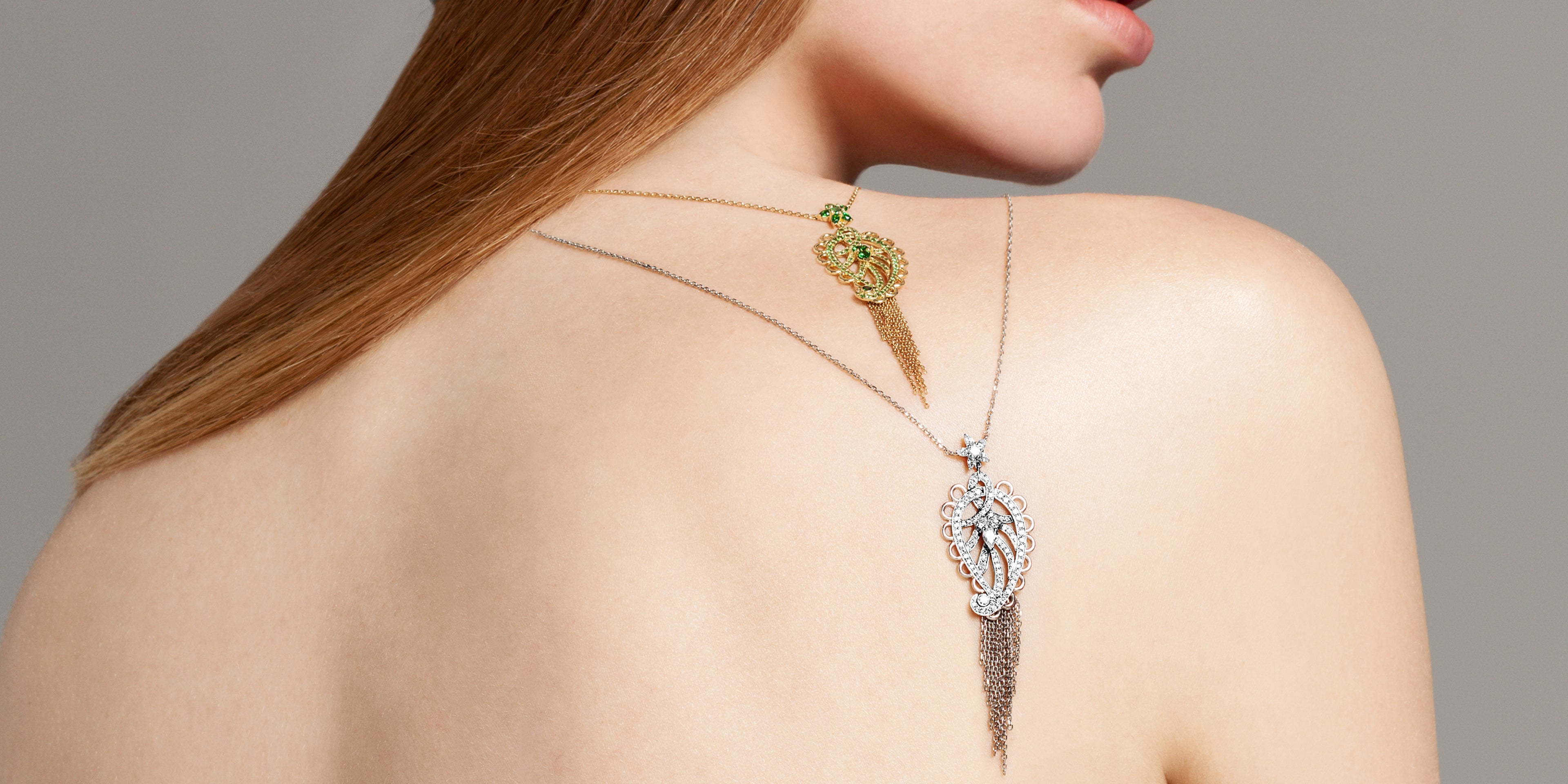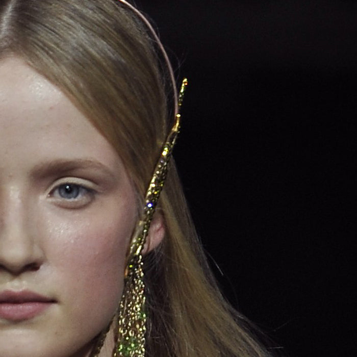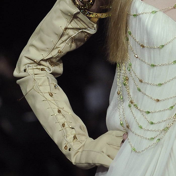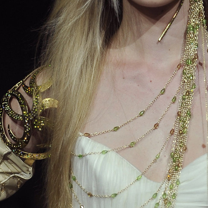 A unique embellishment to the design, combined a light butter coloured handmade Napa leather glove. Ana paired golden metal and chains with jonquil, khaki, lime and cognac shades of crystal, demonstrating her playful use of colour and embodying her freethinking bohemian spirit.