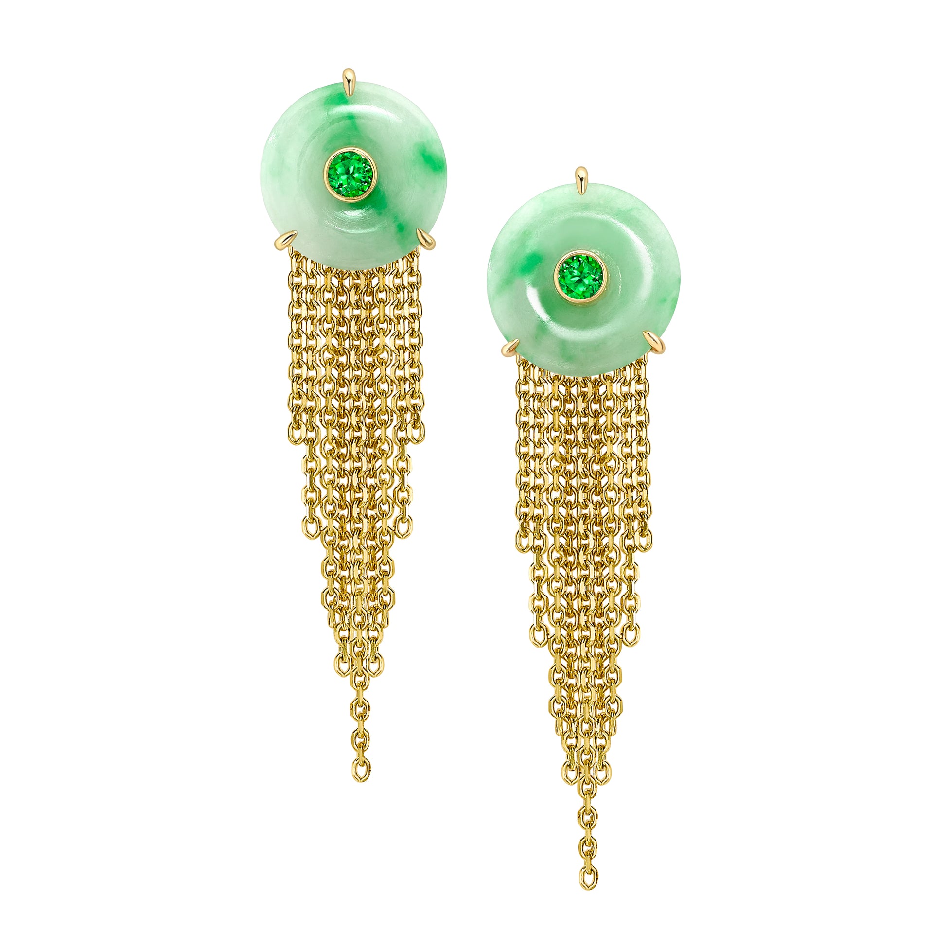 18ct yellow gold and jade tassel pendant. Set with a 0.20ct tsavorite. 18ct yellow gold and jade tassel earrings. Set with 0.20ct tsavorites in total.