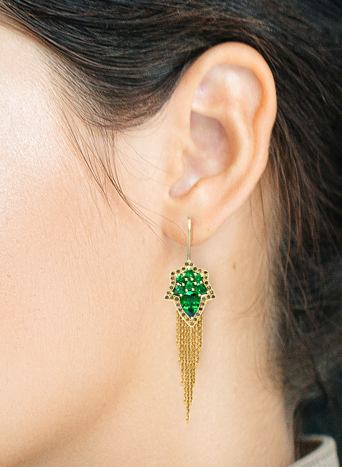 18ct yellow gold and tsavorite asymmetric earrings. Set with 2.07ct of tsavorites and 0.95ct of natural cognac diamonds.